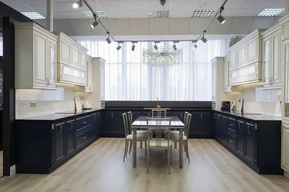 Большая п-образная кухня Адель — вместительный кухонный гарнитур, обеспечивающий разветвленную рабочую зону с удобной эргономикой и многочисленными модулями хранения, что позволяет разнести зоны приготовления, мойки и сервировки по отдельным участкам, облегчить доступ к технике и посуде и создать пространство, удобное для совместной готовки и приема гостей с выдвижными системами, отделениями и полками удобно.