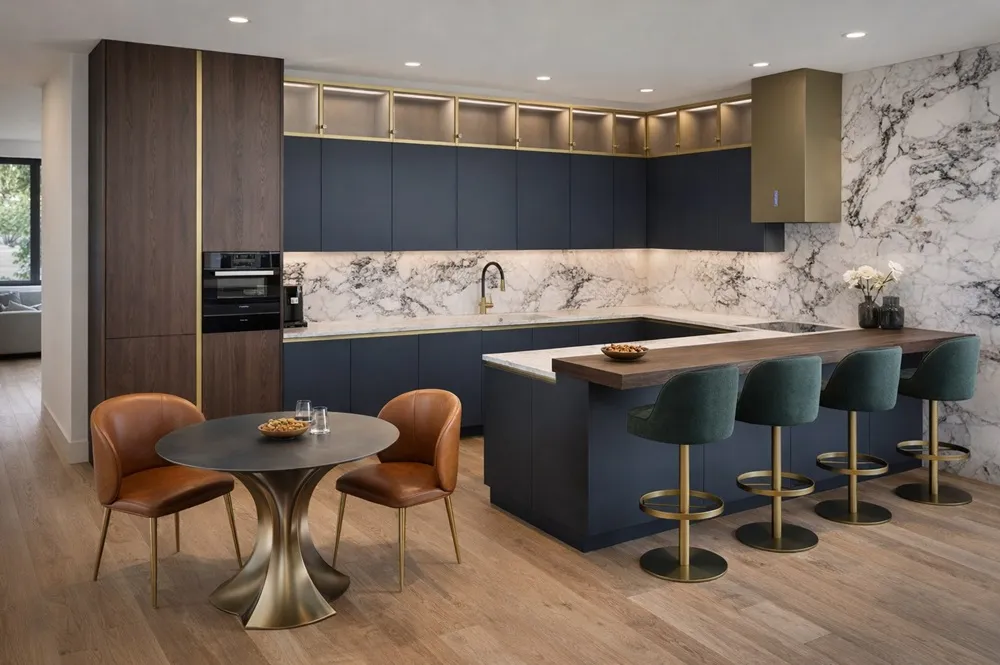 Кухня с островом в современном стиле Клер — благодаря угловой конфигурации кухня становится центром домашнего уюта без потери свободного места. Модули, расположенные под углом, формируют логичную последовательность действий на кухне. Всё под рукой — от продуктов до посуды, что значительно упрощает ежедневные задачи.