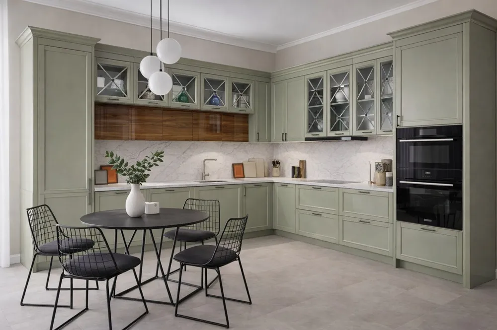 Оливковая угловая кухня Анабель — функциональный кухонный гарнитур, ориентирован на удобную планировку рабочих зон, оптимальное расположение техники и практичную систему хранения, обеспечивающую быстрый доступ к посуде, удобство при приготовлении и порядок в кухонном пространстве благодаря продуманным модулям, выдвижным элементам и логичной компоновке. Сбалансированная эргономика и гибкие модульные решения адаптируют гарнитур под потребности семьи.