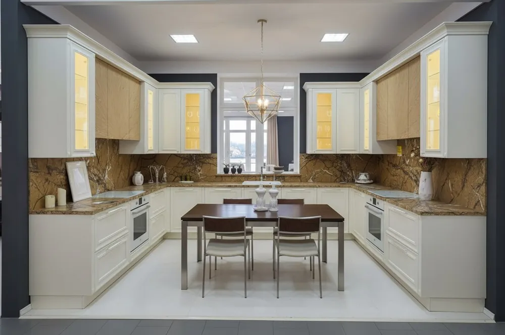 П-образная кухня Френсис — большой кухонный гарнитур с функциональной эргономикой, организуя рабочие поверхности в виде связанной линии, где модули хранения расположены для быстрого доступа, техника встроена в логичных местах, а удобные выдвижные и угловые решения помогают поддерживать порядок и ускорять процесс приготовления с возможностью адаптации модулей под разные сценарии использования семьи.