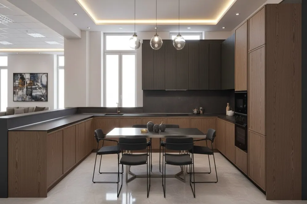 П-образный кухонный гарнитур Олимпия — п-образная кухня, просторный кухонный гарнитур, обеспечивает максимум рабочей поверхности и удобное зонирование, предлагая продуманные модули хранения, логичную расстановку техники и комфортную последовательность действий при приготовлении, сервировке и уборке, что делает кухонное пространство удобным для семьи и гостеприимных приемов. Система ящиков и полок упрощает доступ к посуде и аксессуарам всегда рядом.