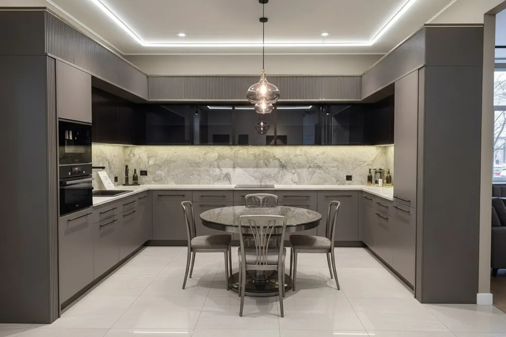 Серая п-образная кухня Виктория — п‑образная кухня создаёт замкнутое рабочее пространство, где всё необходимое находится в шаговой доступности. Такая планировка идеально подходит для активной готовки: холодильник, плита и раковина образуют удобный треугольник. Вместительные шкафы обеспечивают хранение всей кухонной утвари.