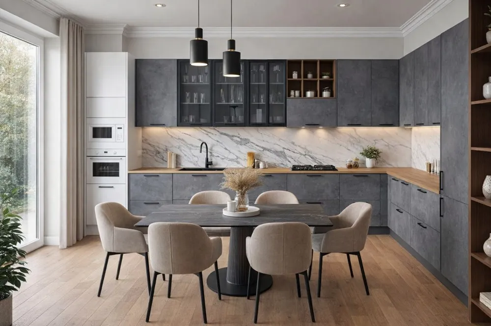 Темный угловой кухонный гарнитур Лилит — практичная угловая кухня сочетает функциональность и удобство. Благодаря расположению вдоль двух смежных стен она оставляет центр помещения свободным, обеспечивая свободное передвижение. Вместительные шкафы и продуманная организация хранения помогут разместить всю необходимую утварь, не загромождая пространство.